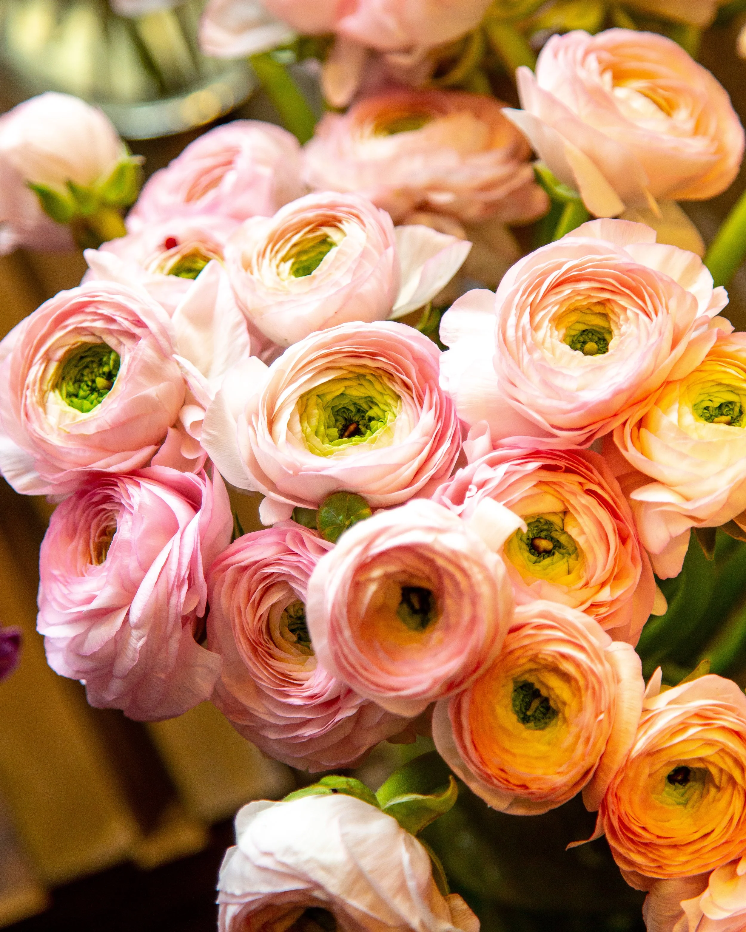 If there's a flower that looks like it belongs in a painting, it's the ranunculus. This romantic flower has layer upon layer of thin petals spiraling outward in shades of blush, coral, gold, and white, each bloom is a small work of art. April is prime time for ranunculus on the farm. They thrive in the cool temperatures of early spring and reward patient growers with an abundance of long lasting, show stopping flowers. They're a favorite among flower lovers for good reason: their lush, peony-like appearance feels both romantic and abundant, making even a single stem feel special.